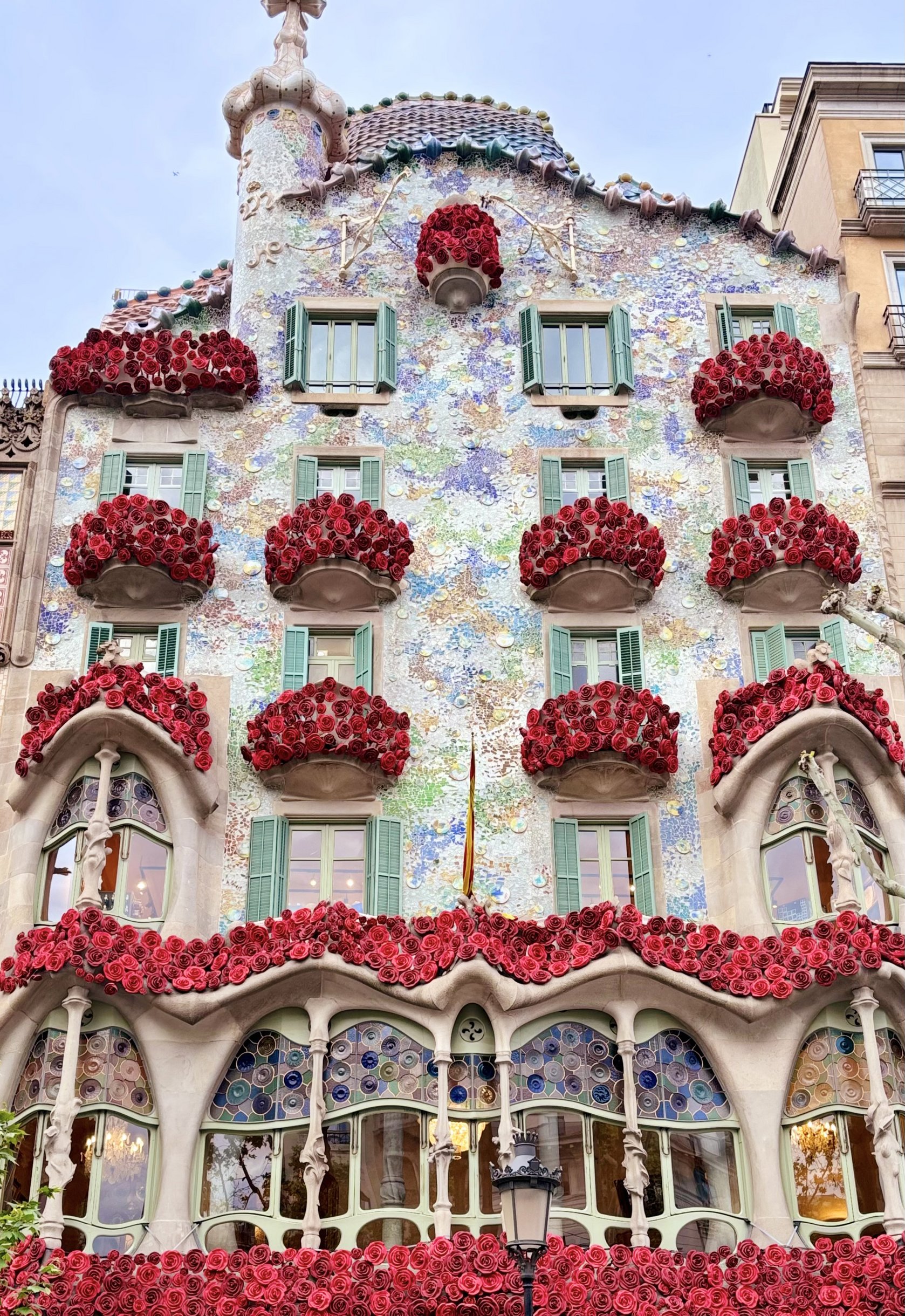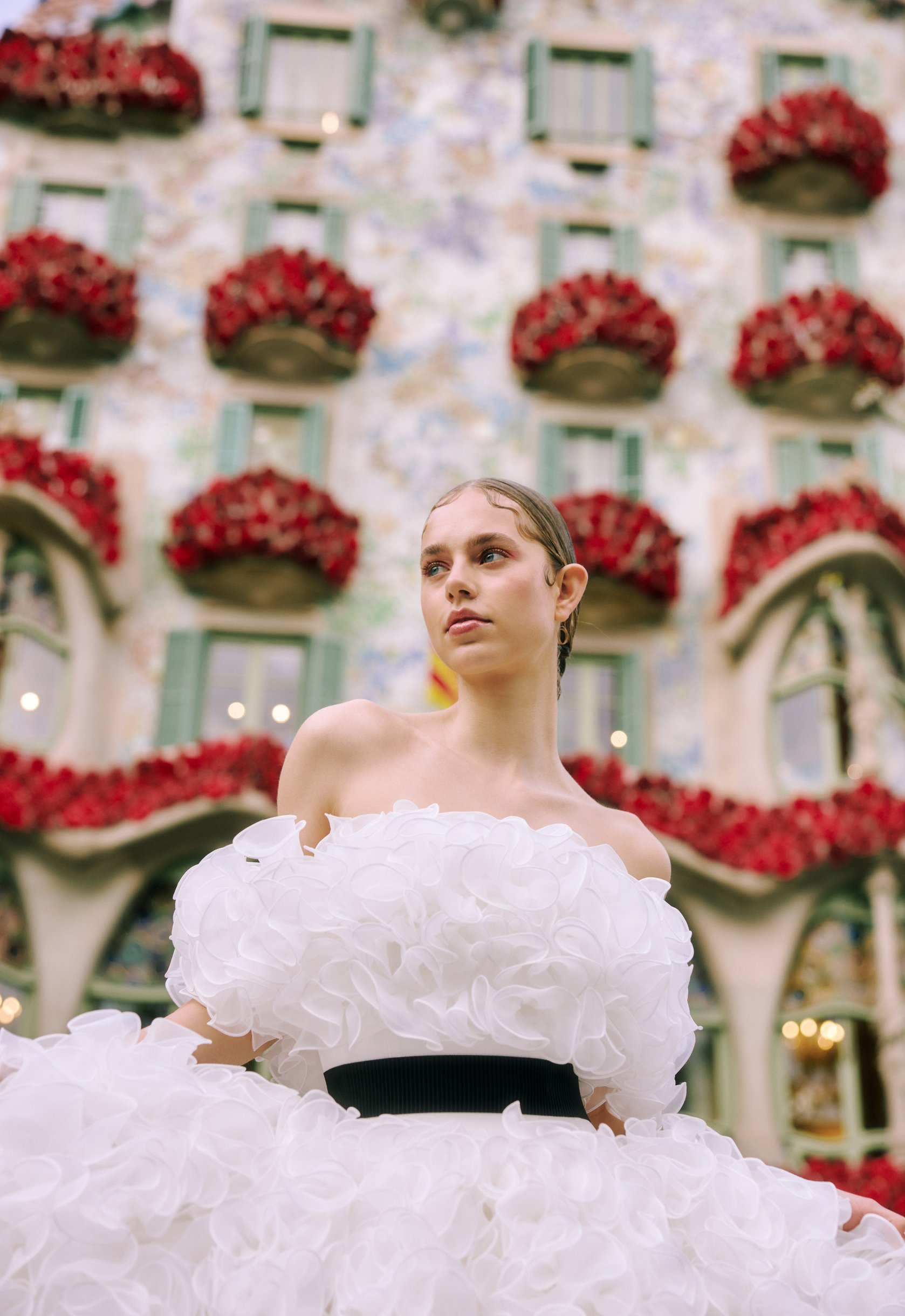 Coincidentally, the day after our shoot marked Diada de Sant Jordi, also known as the "Day of Roses." This meant Casa Batlló was beautifully adorned with rose decorations, providing a magnificent and vibrant setting that perfectly complemented SACHIKO TSUTSUI's wedding dresses. Furthermore, the visuals captured at the Mural del Beso, particularly featuring dresses ST-0017 and ST-0020, surpassed our expectations. The interplay of SACHIKO TSUTSUI's sweet aesthetic with the artistic backdrop of the Kiss Mural resulted in unexpectedly stunning imagery, truly highlighting the collection's beauty.